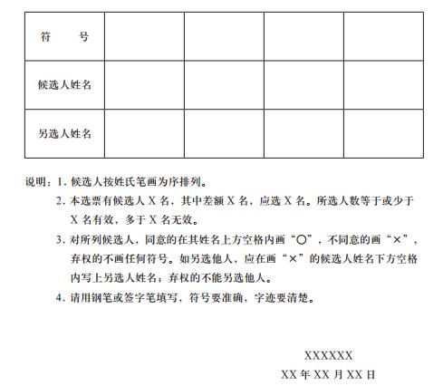 下面,我讲一下填写说明。本选票有候选人 X 名,应选 X 名。对所列候选人,同意的在其姓名上方空格内画“○”,不同意的画“ ”。如另选他人,在画“ ”的候选人姓名下方空格内写上另选人的姓名,弃权的不画任何符号。填写时,请用钢笔或签字笔,字迹要清楚,符号要准确。